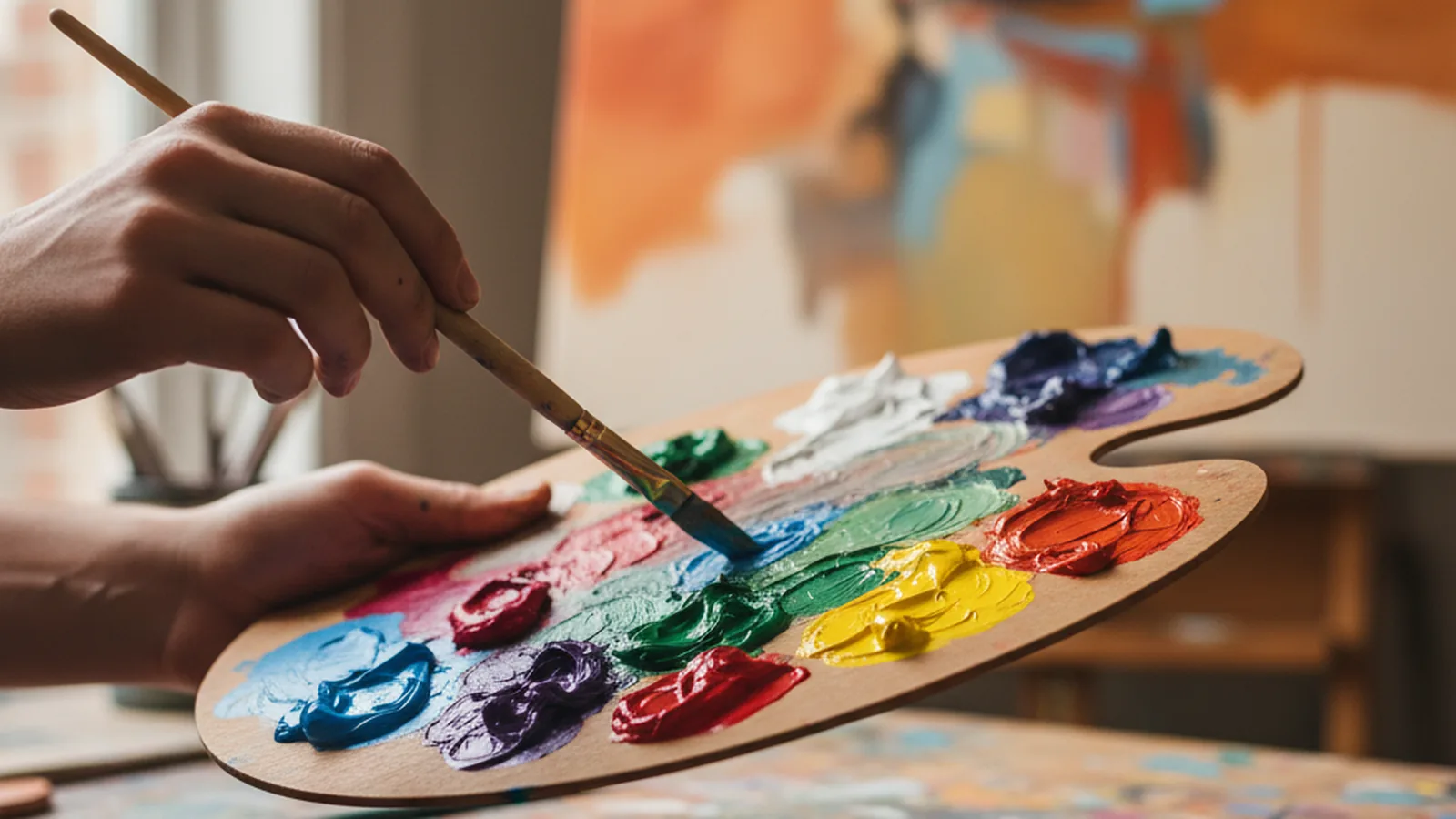 Une toile de 3 à 6 mètres, des pinceaux, un thème commun (vos valeurs, un paysage imaginaire, la vision 2030). Chaque participant peint sa zone puis les frontières s'effacent. Effet cohésion : fort — l'œuvre finale trône ensuite dans les bureaux. Durée : 2 h. Matériel : toile tendue, acrylique, tabliers, bâches de sol.
